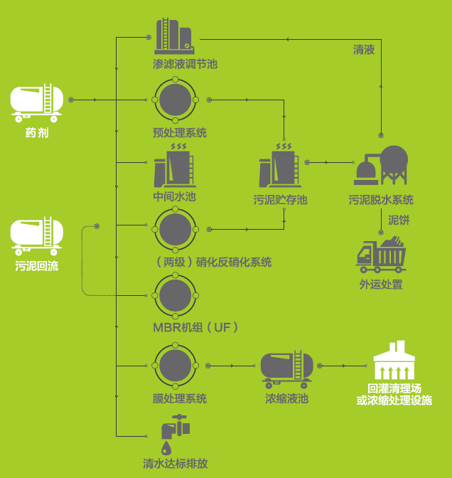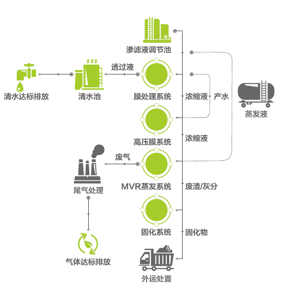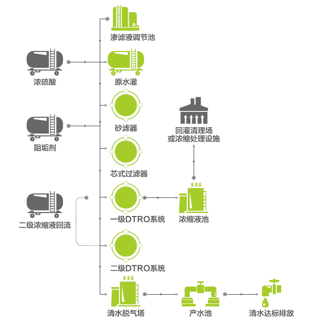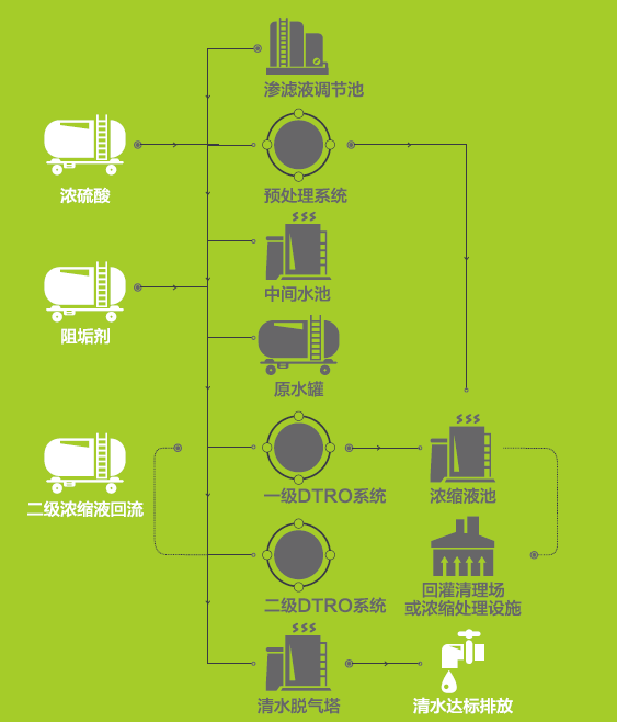 采用高壓DTRO膜分離工藝及MVR蒸發(fā)工藝,均為行業(yè)領先工藝,徹底解決垃圾滲濾液濃縮液處理的難題,從而實現(xiàn)垃圾滲濾液處理近零排放的目標。