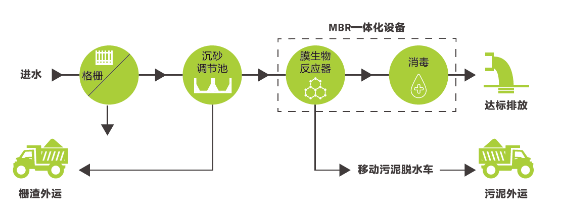 我司一體化設備采用A2O-MBR工藝,處理方法以生化為主,物理方法為輔。經(jīng)由污水干管自流而來的污水首先通過廠區(qū)格柵被攔截掉大粒徑的懸浮物與漂浮物,然后流入調(diào)節(jié)池進行水質(zhì)水量的調(diào)節(jié),再經(jīng)自清洗過濾器過濾后進入A2O-MBR污水處理站。一體化設備由厭氧池、缺氧池、好氧池和MBR膜組合而成,并集合紫外消毒管和電磁流量計,該裝備主要去除有機物、氨氮、SS和磷。MBR出水達標排放,剩余污泥定期排入貯泥池,通過移動污泥脫水車脫水處理后,泥餅進行填埋或綠化處置。