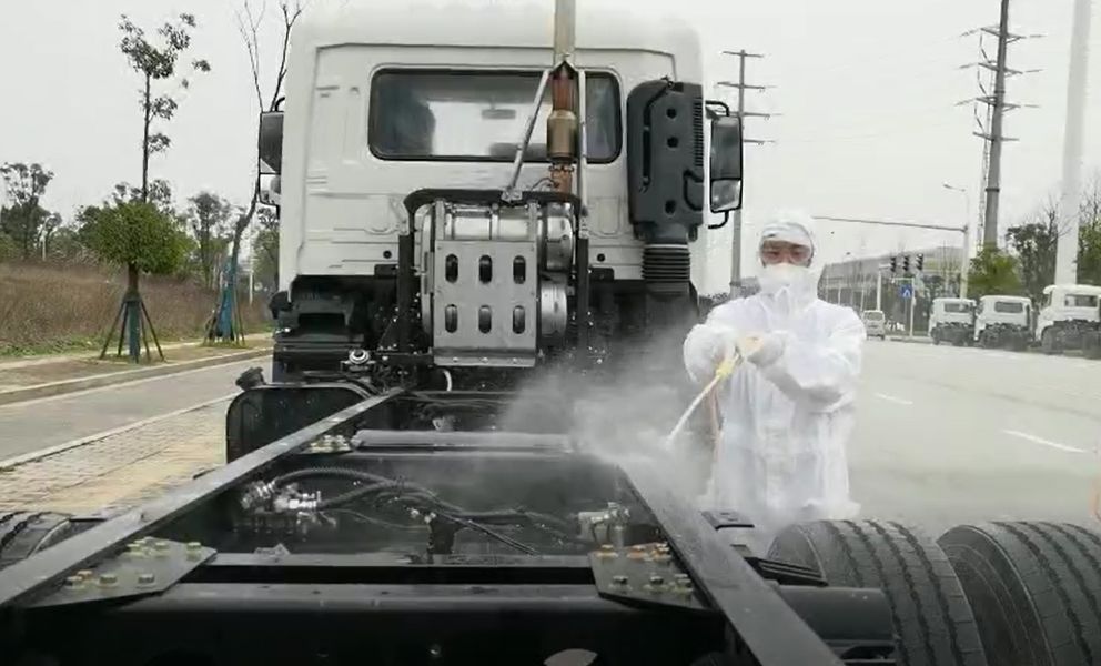 東風(fēng)商用車生產(chǎn)基地在湖北十堰疫情重災(zāi)區(qū),東風(fēng)商用車的物流司機將底盤車送至湖南境內(nèi)的高速路口岳陽北收費站后返回湖北集中隔離,再由盈峰環(huán)境的物流司機接回廠區(qū)。整個交接運輸過程中,每一輛底盤車在出廠、高速路口、盈峰環(huán)境長沙園區(qū)必須經(jīng)歷三次的專業(yè)消毒,確保安全,萬無一失。